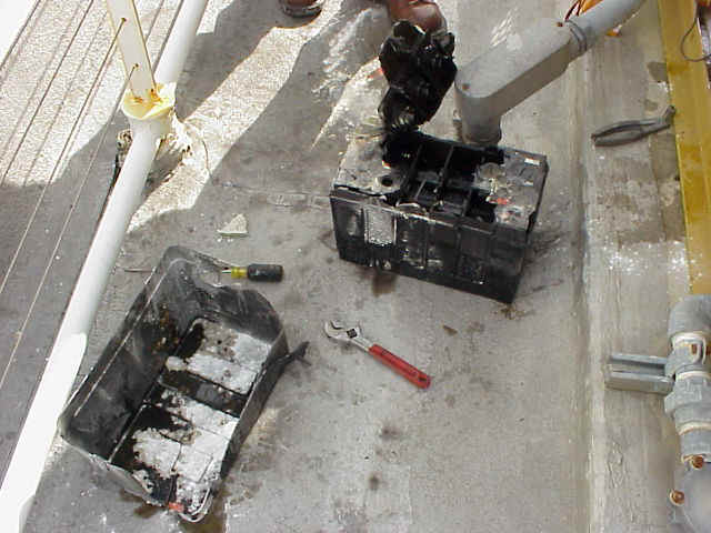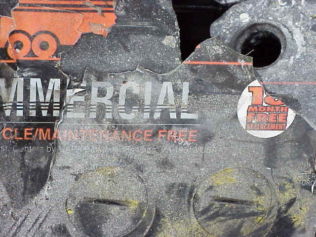 I'm sure you've seen the warnings on 12 volt batteries, and like me, ignored it. Let me relate what happened to me at work today (Jan 03, 2002). We have a 50 kW Katolight standby power generator. It works very reliably and, up until today, was there for every power failure. At about noon, when it usually does it's weekly automatic exercise, I heard a loud bang. I thought it was something simple, like a garbage truck dropping a dumpster, something explainable. So I didn't think much about it. A few minutes later we got a call from someone who works near the transfer switch. A couple years before, I installed a visual and audible warning for the generator. Its logic system gives a 12 volt output when any alarm is active, such as over-crank, when the generator tries to start, but times out. This alarm was on, so I went up to the roof to investigate the cause. The gen set is located in an outdoor enclosure on the roof deck of a 2 story building. The battery is in a battery case on the bottom of the enclosure. It appears that when the generator went to start today, a spark in the battery ignited hydrogen gas which cause it to explode. The inside of the generator enclosure was covered with shrapnel from the battery, the battery box and of course, battery acid. I ran to a hardware store to get baking soda. 5 small boxes later, most of the acid was neutralized. The generator maintenance company came in to replace the battery. Here are some close up shots of the battery after the explosion. The battery and the case it was in. A close up of the battery top "Maintenance Free'? Lessons learned: