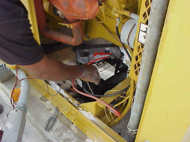 The new battery going in. This one has caps and will need to be refilled, but maybe it won't explode as easily. The outside of the generator 1/7/2002 I just wanted to let you know that your warning didn't end up in a dead end here in cyberspace. It has made the first of many trips here at "Fire-L" at www.firefighting.com discussion board. As a good lesson, I will make mention to the lieutenants at our firehouse to inspect the batteries a little closer on our fire trucks and two generators. It just goes to reason that one can not leave anything to chance. Even though our trucks are inspected every Monday evening during house duty, the batteries , at the very least should be inspected monthly. Thank you for those powerful pictures. They say that pictures speak a thousand words. And its true. Seeing IS believing. Asst. Chief Mike Gibson, Amwell Valley Fire Co. Ringoes, NJ 1/8/2002 I experienced that same battery problem first hand in Breezy Point FD on a roof top electronic siren. I had just hooked up the leads on an older maintenance free battery turned away to grab a wrench to tighten up the terminals and it exploded all over me on the roof top. The front of the battery blew off and hit my right thigh so hard it felt and looked like I had been hit by a baseball bat, and my ears were ringing for about two days. I was totally covered in acid head to foot . The FD was toned out and it turned out the chief was downstairs in a store right under where I was working. I had run into the bathroom and was rinsing my face in the sink, he walked in ordered me to strip off my acid soaked cloths. Then he walked to the fridge pulls out the box of baking soda from the back of it and covered me in it. then I took a ride to the hospital to have myself checked out. That was an experience that taught me an awful lot of respect for old batteries. That web site sure hit home Thanks, Jeff Schneider 1/10/2002 My father served during WW II in Burma India. As an Engineer in the Army building roads and landing strips , he told this story many times. A Jeep came in to Motor Pool where he was working that day with ignition problems and he proceeded to check the battery first . Simply hooking a tester to the battery caused an explosion. The only thing that saved his eyes was the prescription glasses he was wearing , with fast action from some very well trained Medics his face survived too but , just because they were RIGHT THERE and knew what to do !!! Master Sgt. . Willett M. Bruner went on to fight many battles while preparing the way for many more G.I.'s to join him and many others in securing our freedom during this war. God rest the soul of Master Sgt. Willett M. Bruner and every other person who has made the ultimate sacrifice for our Freedom . Col. James L. Bruner 1/11/2002 Hi Ray, Thanks for the lesson photos... I learned of your page on Fire-L. I work with batteries often as part of solar power systems and yes, the threat of hydrogen explosions is very real! Be aware though, that a battery with vented caps is even more likely to explode than the "maintenance free" one was. The refillable batteries generally outgas more H2. There are at least 2 things to be learned here... first, make sure the battery enclosure is well vented and that escaping H2 (which will rise) will not collect. Second, the main cause for outgassing is excessive charge current... check to make sure the trickle charger is set properly for this battery. If proper venting is a problem, then sealed gel lead-acid batteries might be a good alternative. These are commonly available in sizes up to 8D. Note that they need a slightly different charge voltage than the wet cell batteries. cheers, 1/16/2002 Thank you for sharing your story and photos. I hope that people become more aware of the dangers that go along with battery's and that this helps prevent future battery mishaps James D. Walker 2/7/2002 My Dad is deaf as a result of a car battery exploding. The only warning was the battery post was loose in the case. He was fortunate to be standing beside the car not in front. The hood of the car deflected the debris and acid forward and away from him. This happened about four years ago, he has never regained his hearing. Dale Painter My thanks to those of you who have provided more information and stories about other battery explosions. If you wouldn't mind, if you have something to share on this page, please e-mail me and specify that I can share your message here. Your experiences could save injury to others. Thanks. From: "Per-Erik Sundberg" <per-erik.sundberg@transit.se> Dear Mr. Vaughan, View this article only Could someone give some advice on a mishap that just happened to my 9-5