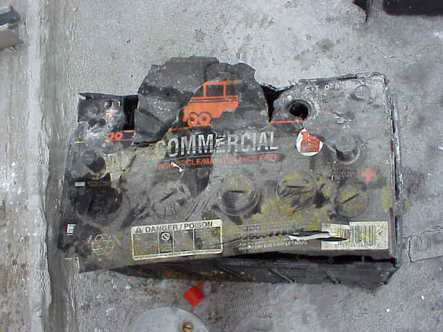 More horror stories at http://www.rayvaughan.com/battery_safety.htm Post a follow-up to this message ©2002 Google Ray, I have a 1986 BJ70 Toyota Landcruiser which uses two 12 volt batteries in series to provide the required 24 V DC needed. I've been having problems getting the truck started for the last week and was going to have a load test done. The engine would turn over very slowly then finally pick up enough speed to start. BTW, the truck had been parked for about 4 moths with out being started. This morning though, I could hear the starting relay clicking away but could not see the glow plug light come on, so I turned it to the preheat position again and then, when not seeing the light come on again, I turned the ignition to the start position, there was a bang like a rifle shot and some smoke was coming out from under the hood. I opened the hood and one of the batteries was in pieces. The only thing left was the bottom part of the case with the plates and the neg. & pos. rods that go from the plates to the lead post on top. Everything else had blown apart and acid was covering everything. I went into the house and got a box of baking soda from the fridge (used as a deodorizer) dumped three quarters of it into a jug and filled with hot water, stirred it up then went outside and dumped it all over the battery, engine, fender, etc. There was some baking soda left in the bottom of the jug that did not dissolve so I refilled it and dumped it all over like the first time. Hopefully this will neutralize any remaining acid. If not how would I know if it has? Thanks, Graham. P.S. I know have two new batteries and hopefully this will fix the problem. From: "Dawn Eshelman" Just had it happen to me! Spent the day cleaning my car, inside and out. Filled it with gas that